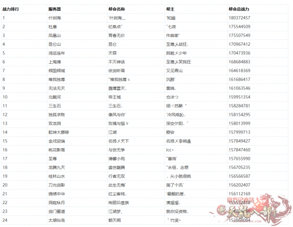 另外还有帮会总战力排名第一的什刹海帮会以及第二名的忆焦点ˇ帮会也是实力雄厚,在去年的凤凰邀请赛表现可圈可点;