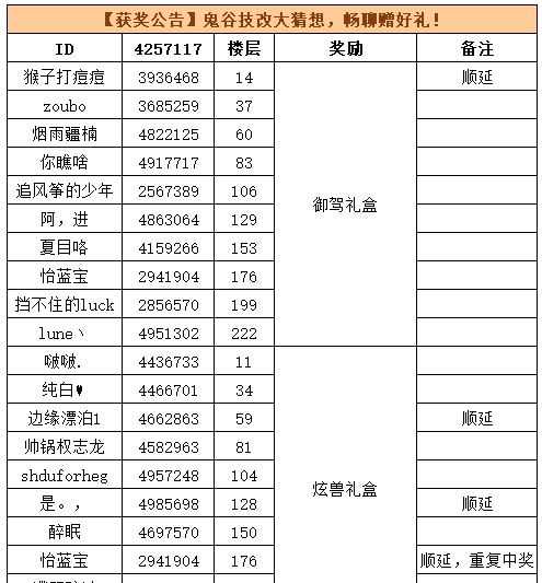 【活动】鬼谷技改大猜想,畅聊赠好礼! 已结束,感谢大家热情参与,现公布获奖名单 恭喜以上获奖玩家,重复中奖者只取最高奖励发放 ※兑换码会在近期陆续发放请留意自己的论坛私信并及时到大理龚彩云兑换使用 ...