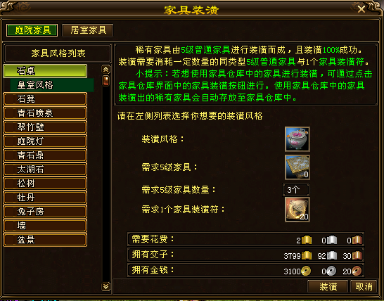 对应NPC2:鲁家财(坐标133,147)功能:使用低级家具合成高级家具和稀有家具。