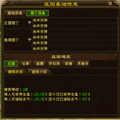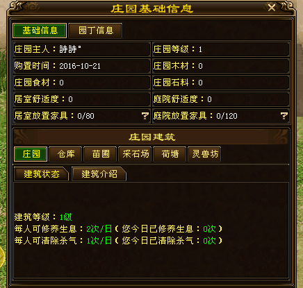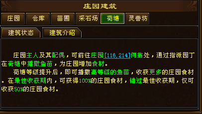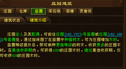 可以看到庄园内的建筑除了庄园主体本身,还有5项功能建筑:仓库、苗圃、采石场、荷塘、灵兽坊。
