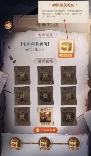 首次闯关:可领取“初涉边关礼包”,有机会开出永久时装:觅韶华。