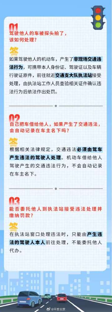 【有问必答】①驾驶他人的车被探头拍了,该如何处理?②自己把车借给他人,如果产生了交通违法,会自动记录在车主名下吗?③能否委托他人到执法站接受违法处理并缴纳罚款? ...