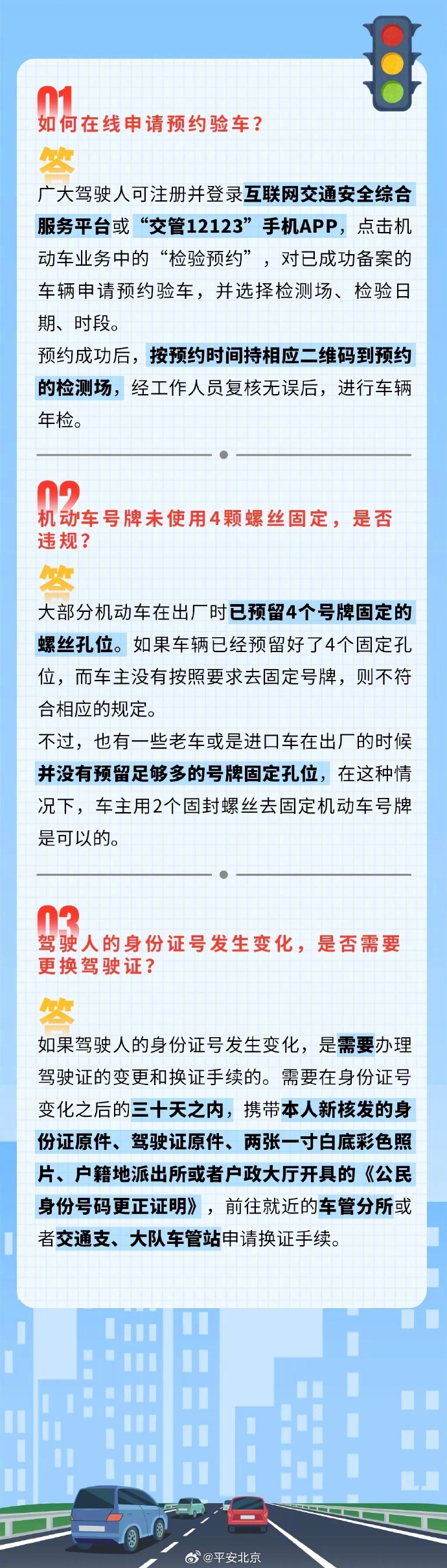 #小安政务服务解答# 【@北京交警 有问必答】①如何在线申请预约验车?②机动车号牌未使用4颗螺丝固定,是否违规?③驾驶人的身份证号发生变化,是否需要更换驾驶证? ...