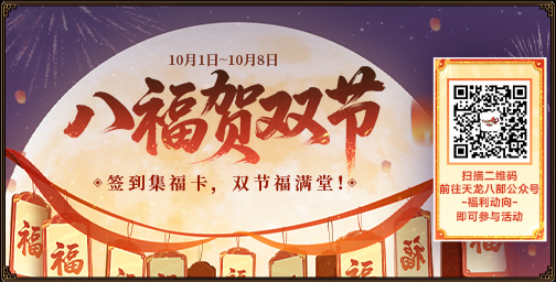 “八福贺双节”活动火热进行中!即日起至10月8日24点,等级≥30级的少侠,扫描下方二维码,前往微信公众号即可参与活动赢得丰厚奖励!