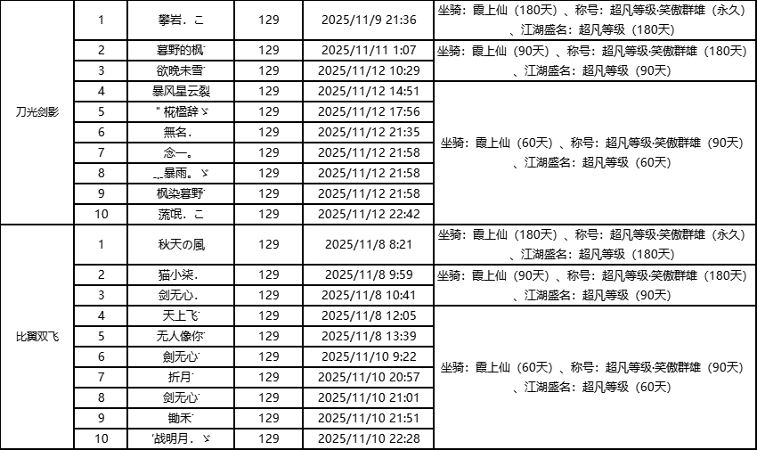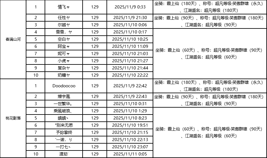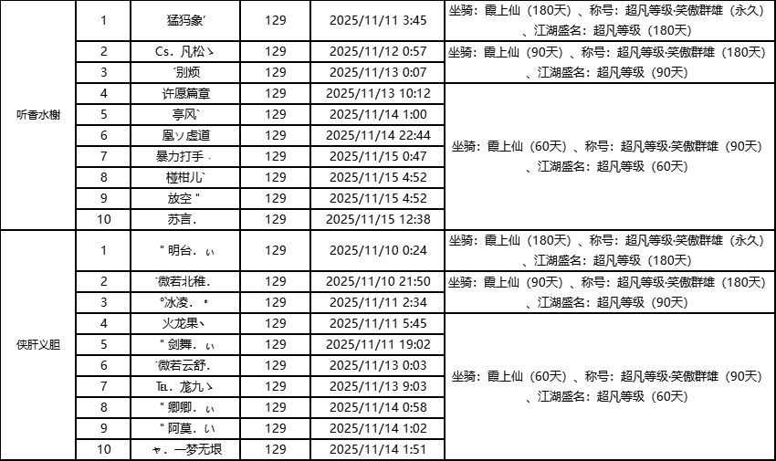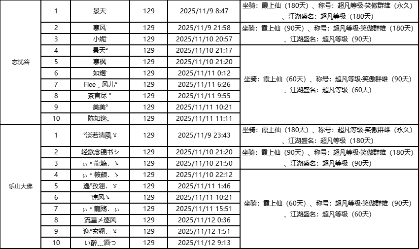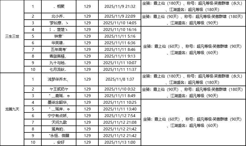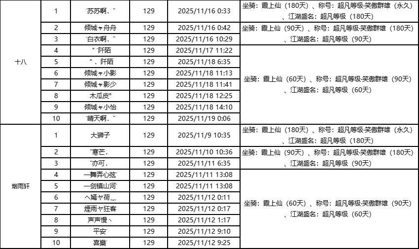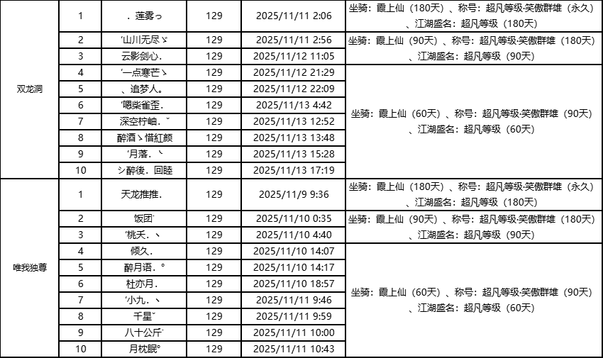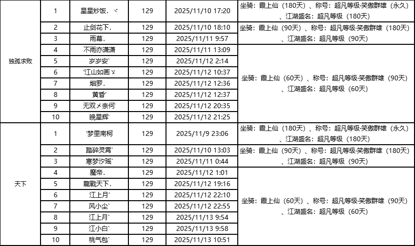 单服等级榜少侠信息: