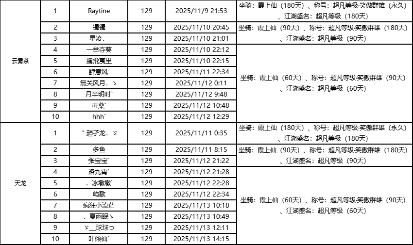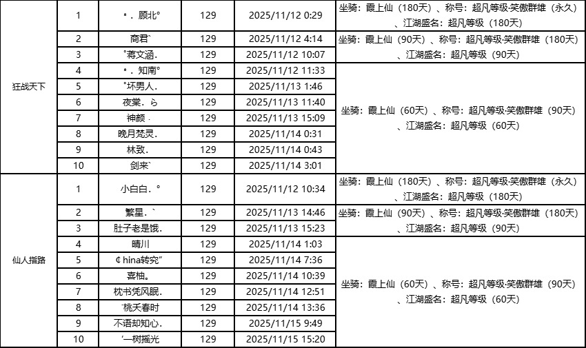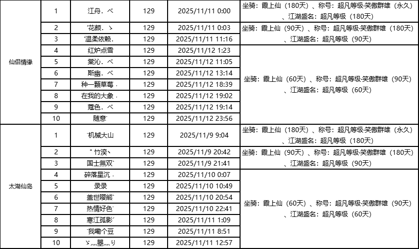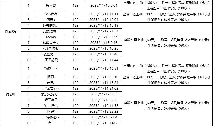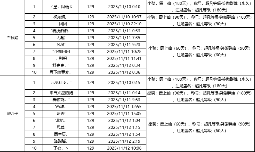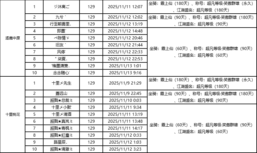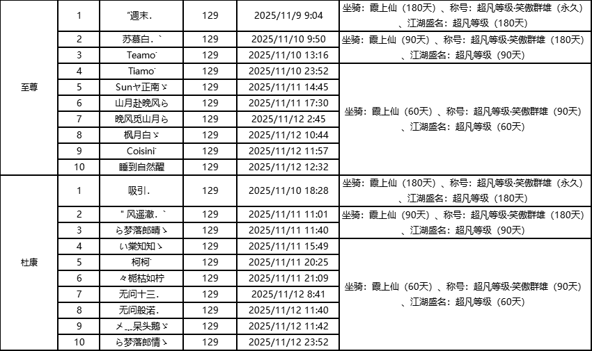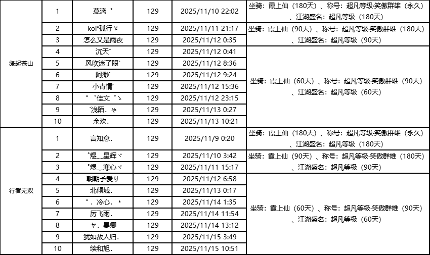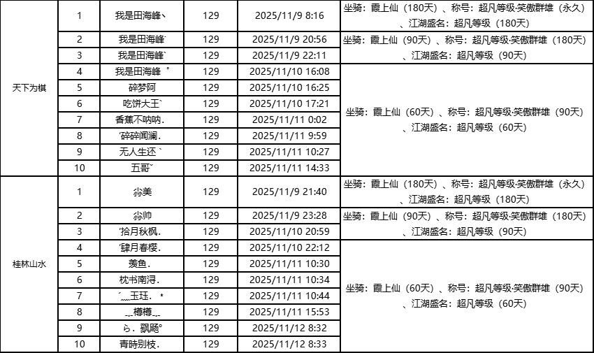 单服等级榜少侠信息: