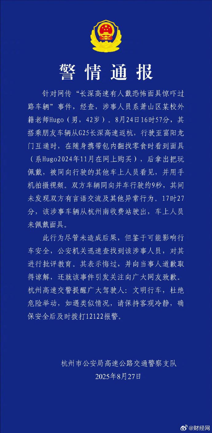 杭州市公安局高速公路交通警察支队2025年8月27日凌晨通报:针对网传“长深高速有人戴恐怖面具惊吓过路车辆”事件,经查,涉事人员系萧山区某校外籍老师Hugo(男,42岁)。8月24日16时57分,其搭乘朋友车辆从G25长深 ...