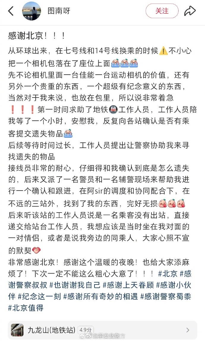 8月24日晚,@北京公交警方 民警在地铁7号线九龙山站接一乘客求助:称自己在九龙山站下车后不慎将包遗忘在了车厢内,包内有她父亲的遗物。 经了解,该乘客的父亲生前是一名抗战老兵,去世后留下的遗物被她放在随身包 ...