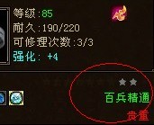 在装备的右上边,星级下面会出现“百兵精炼”四字