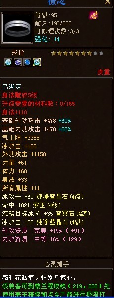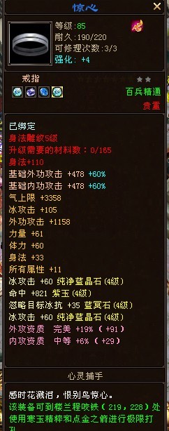 右边一图则为使用资金游龙卡后,装备的状态(如85级装备的95的戒指)