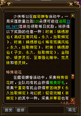 任务奖励也比之前好了,希望大家都能拿到衣服。活动中采集到特殊荷花还有机会拿到新武器:轻荷戏鲤