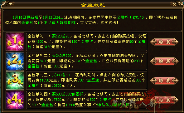 这次更新了金蚕丝四重礼,跟以前还是一样的,需要饰品体力的兄弟们可以拿四重