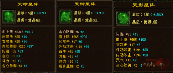 星阵星级的提升,星阵会给星阵的基础属性和洗炼属性额外加成(也就是下图中蓝色字体的部分),可以理解为装备升级王权和天道的加成。