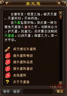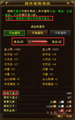 星阵等级提升的道具是:天星点。在天荒商行购买浑天璞石,使用后可获得天星点。