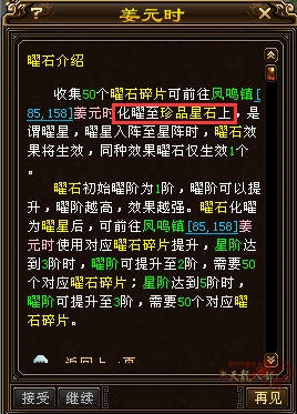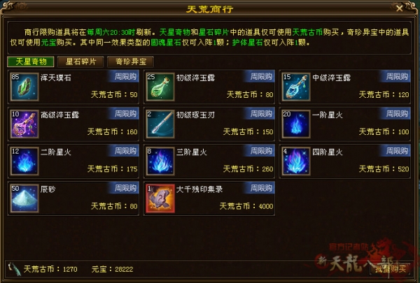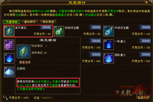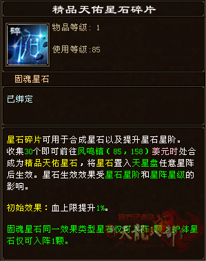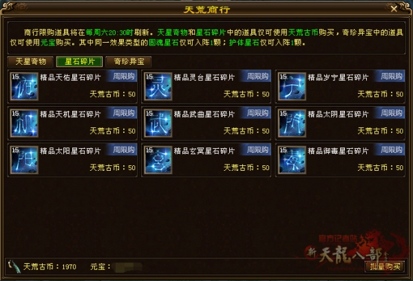 精品星石碎片了通过天荒商行进行购买,收集30个精品星石碎片可合成一个精品星石,类似无字谱秘技的合成方式。