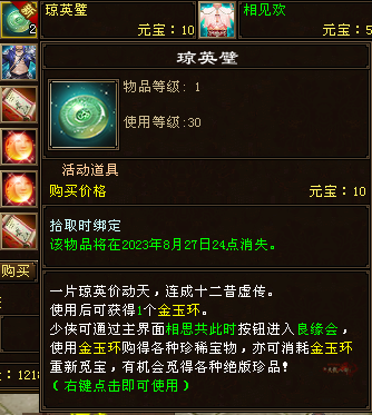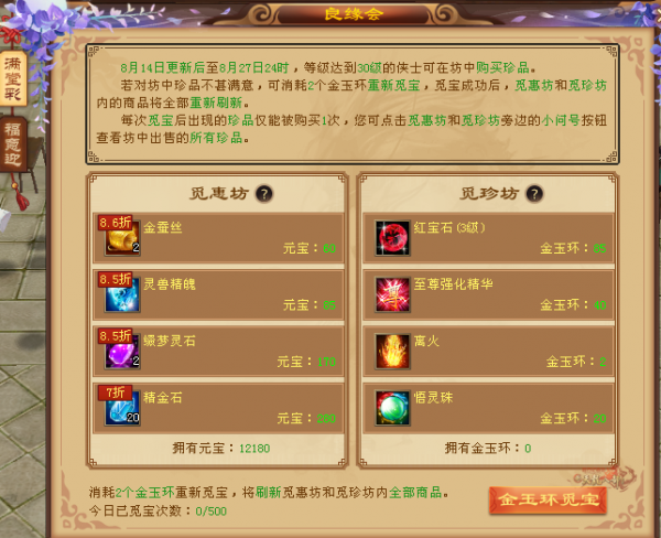这次的商店跟之前集市差不多类型,刷新商店很简单理解,刷新道具就是金玉环,10yb元宝店有卖