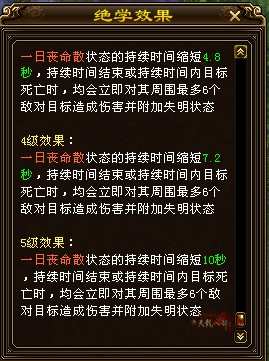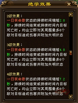 【改动】原一曰丧命散的持续时间缩短,初始1.2秒【升级】最高持续时间可缩短至10秒