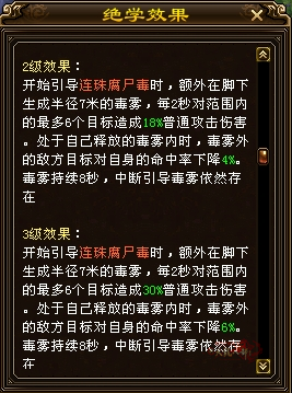 【改动】原连珠腐尸毒引导时额外在脚下生成半径7米的毒雾 每2秒对范围内的最多6个目标造成8%普通攻击伤害