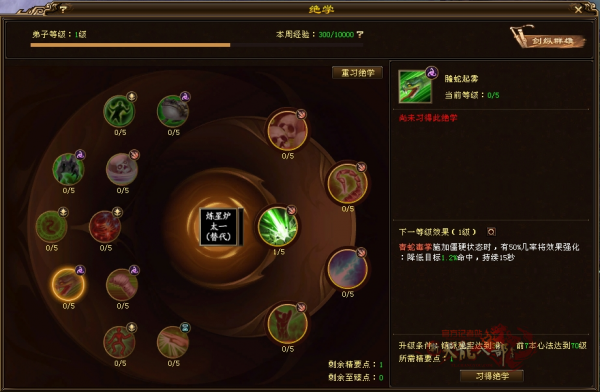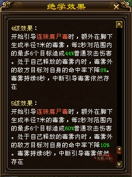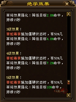 【改动】青蛇毒掌施加僵硬状态时,有50%几率将效果强化: 降低目标1.2%命中,持续15秒【升级】最高有50%几率将效果强化: 降低目标10%命中