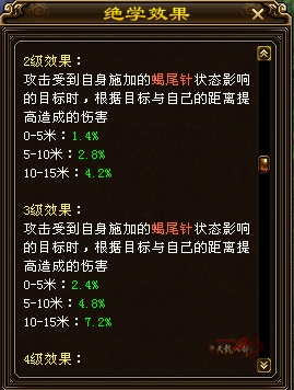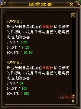 【改动】原蝎尾针增加远程输出伤害,给敌人施加状态敌人离得越远根据目标与自己的距离提高造成的伤害就越高,距离与伤害对比是