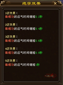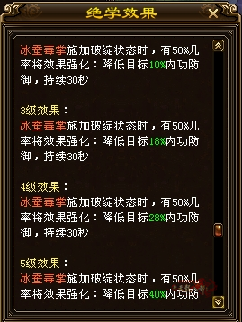 【改动】原冰蚕毒掌新增施加破绽状态时,有50%几率将效果强化:降低目标4%内功防御,持续30秒【升级】最高有50%几率将效果强化:降低目标40%内功防御,持续30秒