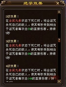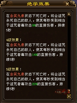【改动】原含笑九泉新增死亡时将会诅咒杀死自己的敌人使其每秒受到相当于诅咒者毒攻击2%的直接伤害 ,持续5秒
