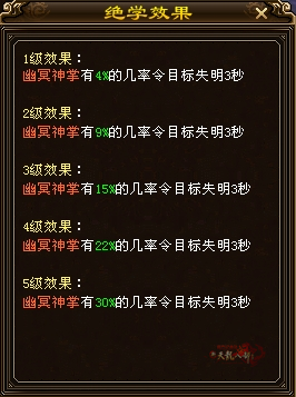【改动】原幽冥神掌新增有4%的几率令目标失明3秒
