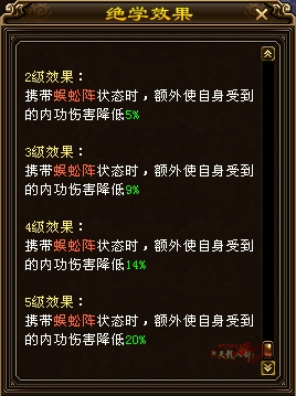 【改动】原蜈蚣阵新增减内功伤害效果初始降低百分之2【升级】减内功伤害效果最高降低百分之14