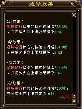 【改动】原经脉逆行持续时间增加1.2秒,并使减少血上限效果降低0.6%【升级】最高持续时间增加10秒,并使减少血上限效果降低5%