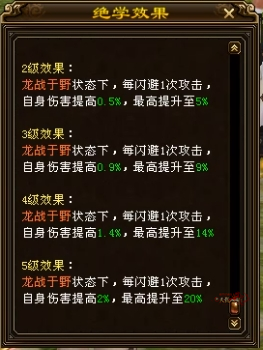 【升级5级】龙战于野状态下,每闪避1次攻击自身伤害提高2%,最高提升至20%