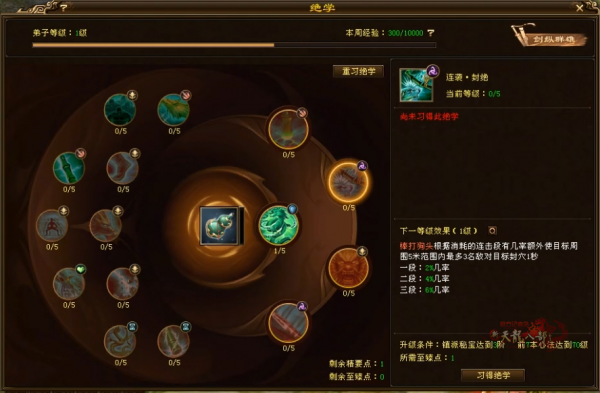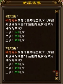 【升级5级】棒打狗头根据消耗的连击段有几率额外使目标周围5米范围内最多3名敌对目标封穴1秒