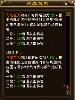 【升级5级】飞龙在天的冷却时间增加为5秒,根据消耗的连击段额外对目标周围5米范围内最多3个敌对目标额外造成伤害