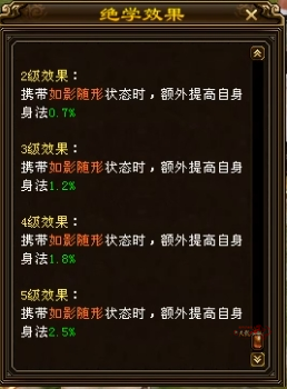 【升级5级】携带如影随形状态时,额外提高自身身法2.5%