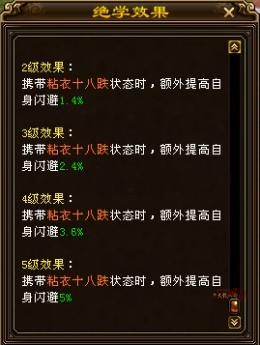 (概括:提高闪避) 【改动1级】携带粘衣十八跌状态时,额外提高自身闪避0.6%