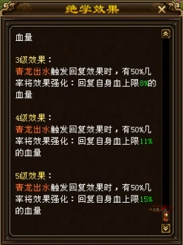 【升级5级】青龙出水触发回复效果时,有50%几率将效果强化:回复自身血上限15的血量