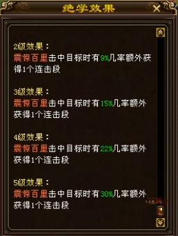 (概括:额外获得连击段) 【改动1级】震惊百里击中目标时有4%几率额外获得1个连击段