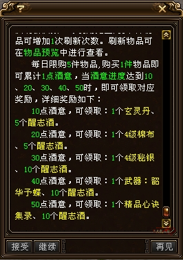10点酒意:可领职:1个玄灵丹、5个醒志酒