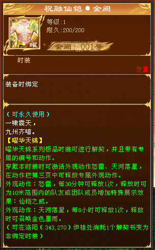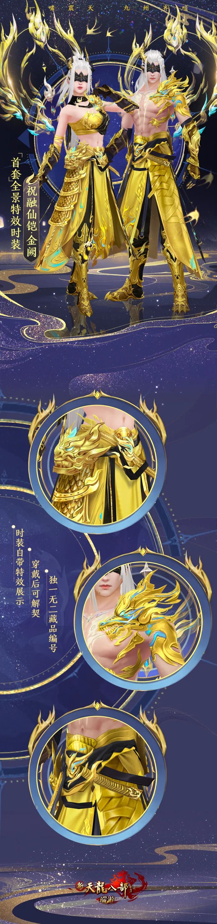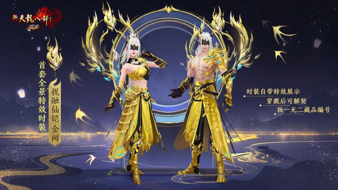 珍贵收藏外观祝融仙铠·金阙无限解契尊享编号专属全景效果祝融仙铠·金阙作为经典天龙首套藏品级外观,不仅可以通过外观专属的全景特效和动作,实现"摘下星星送给你""陪你去看流星雨"的绚丽操作;还享有专属藏品编号、可无限次解契的专享加持,独一无二、极致尊享!