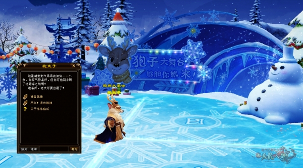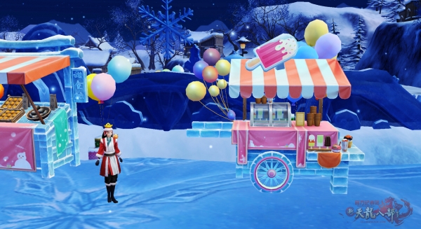 巧克力冰棒变身:在冰雪不夜城入口旁的冰棒摊,找到 NPC 张巧(200,252)、王年(191,170)、李冰(128,170)购买巧克力冰棒。吃了冰棒后会随机变身成动物冰雕,且冰雕状态不可手动取消,需路过的玩家使用温泉水解冻。