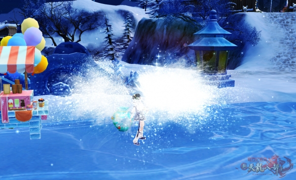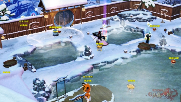 泼水成冰:冰棒摊旁有温水缸,找 NPC 武淼(135,148)购买水瓢,在温水缸中采集温泉水后,将水洒向空中可欣赏泼水成冰的场景。