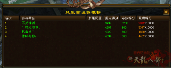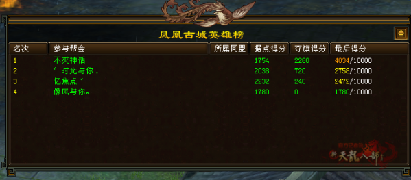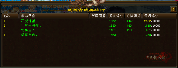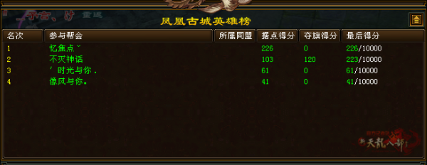 9点25分左右,不灭神话队伍以10000积分拿下凤凰古城争夺战第一名,夺冠!