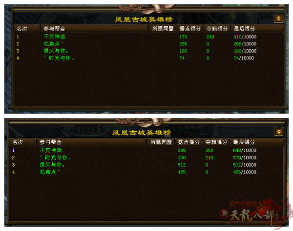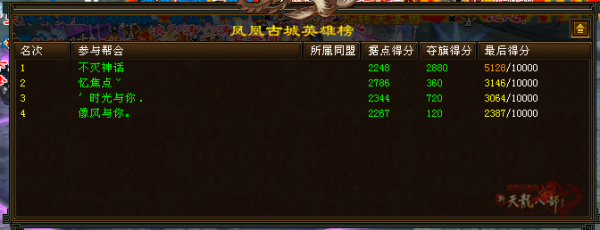 晚8点一开场,忆焦点ˇ帮会就抢先进入凤凰古城争霸赛赛场,首先拿下第一个帮会分数;