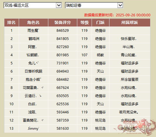 首先从帮会评分排行榜来看,帮会实力均衡,难道真的是大一统的局势吗?