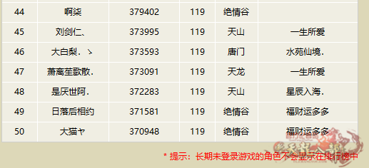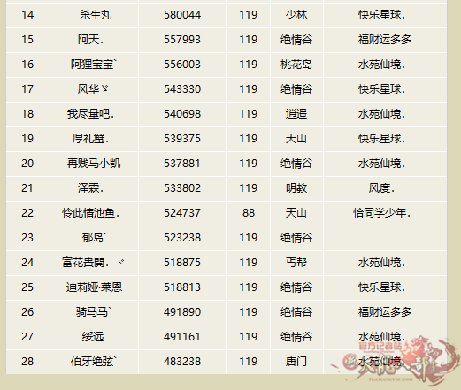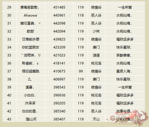 门派分布来看依然是绝情谷占尽优势:绝情谷23位,接近半数;明教2位,天山7位,桃花岛6位,少林2位,逍遥2位,丐帮1位,唐门4位,天龙1位,恶人谷2位。