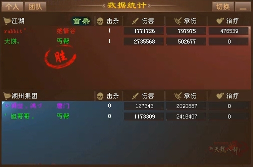 第一场3V3,开局【江湖】就目标明确,全员集火【湖州集团】的丐帮,很顺利的强杀拿到首杀。