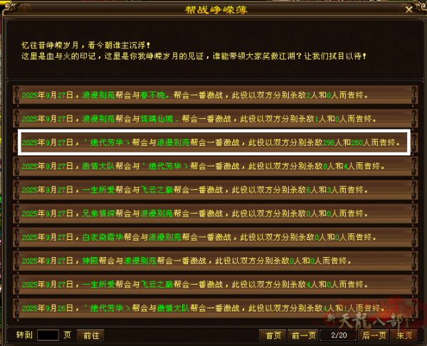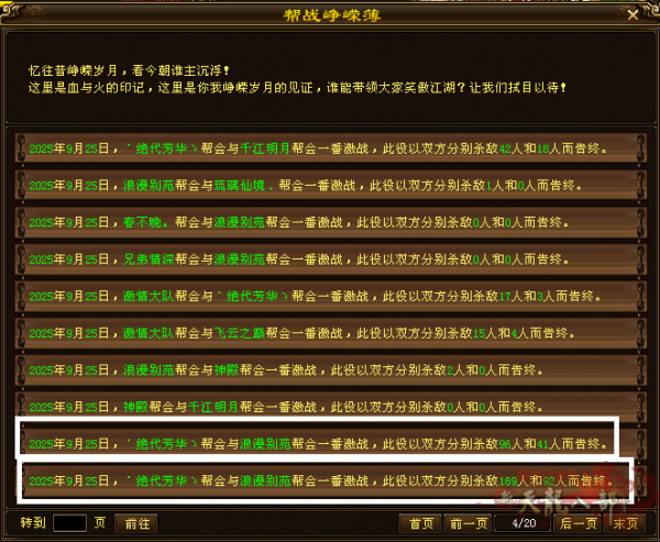 从帮会峥嵘榜上可以看到,连续几**都有小型帮战,分别是˙绝代芳华ゝ与浪漫别苑;