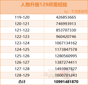 从119升到129需要大约110亿经验,