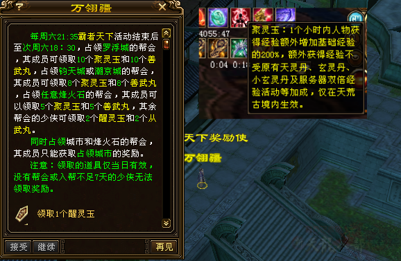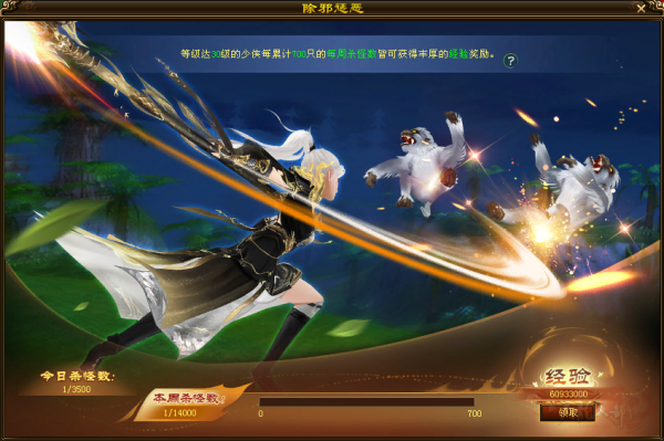 每周只要杀怪累计够700只,就能去大理(213,141)领额外的经验奖励。