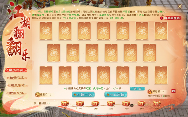 每轮有20张福运牌,其中必定包含至少1份稀有奖励(神品奖励和珍品奖励)。