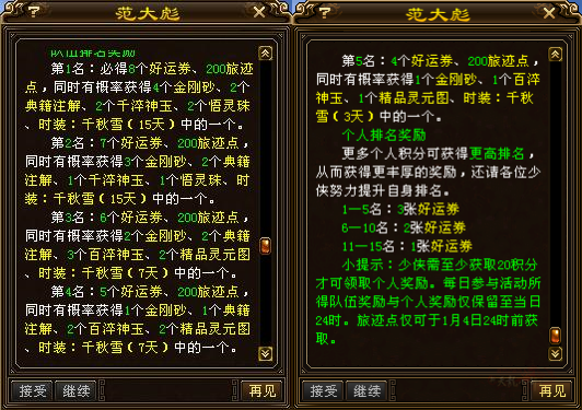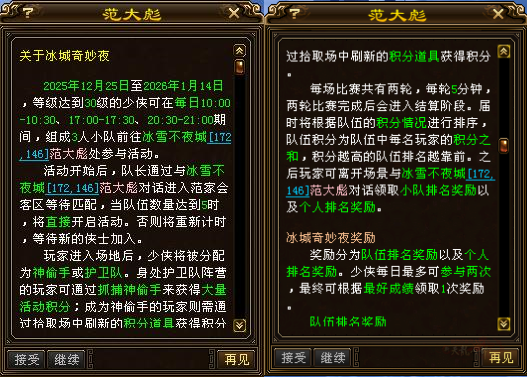 参与方式:3人组队,去冰雪不夜城(172,146)找NPC范大彪进休息室